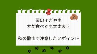わんことの日々 栗のイガや実、犬が食べても大丈夫?秋の散歩で注意したいポイント 秋になると、栗の木の下にはイガ付きの栗や落ちた実がたくさん。犬が興味を示して口にしてしまうことがありますが、実は注意が必要です。この記事では、栗のイガや実の危険性・応急処置、そして50代飼い主としての散歩中の工夫をまとめます。栗のイガや実の... 2025.09.13 わんことの日々